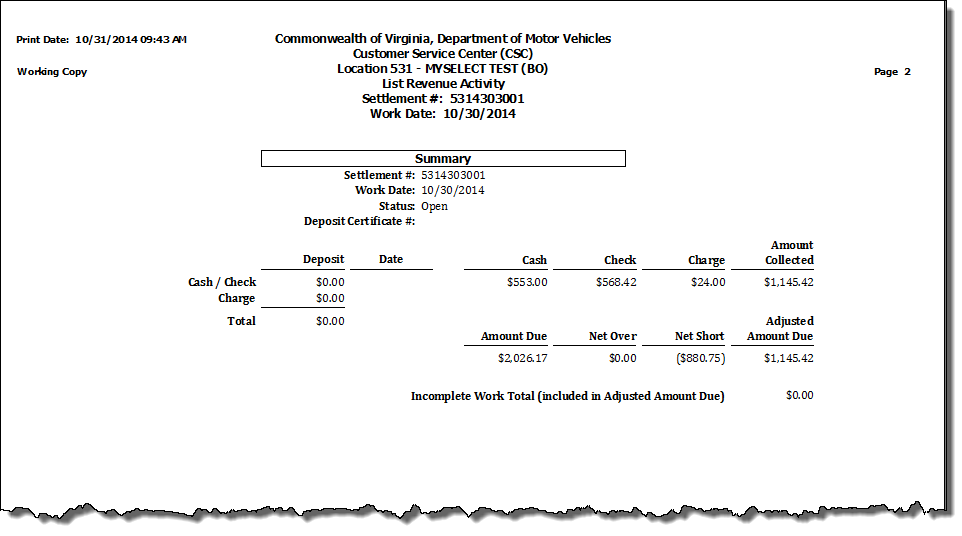 List Revenue Activity displays all revenue collected per teller for a particular work day and settlement number.