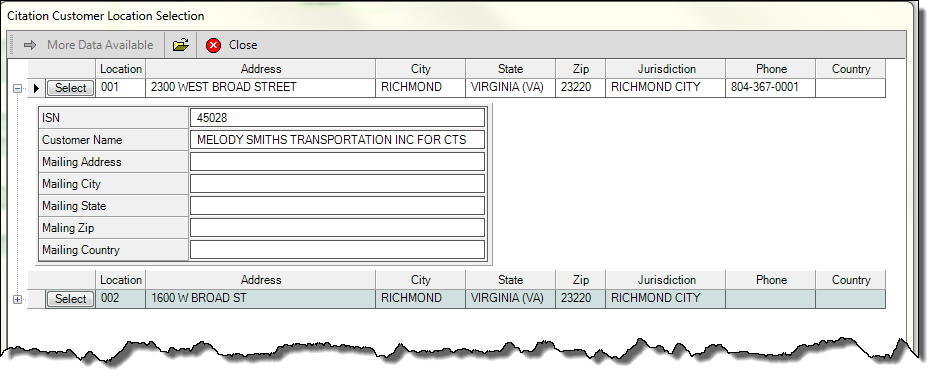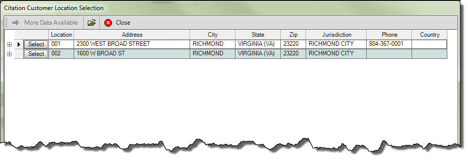 2. If the customer number entered has multiple address locations, The Citation Customer Location Selection grid will open. Click the Select