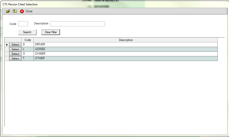 | • | Use the Code search option by entering the violation type code number in the Code box. Click the Search button to display that type. Click the Select button next to the type. |