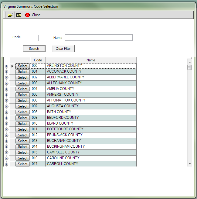 | • | Use the Code search option by entering the DMV court jurisdiction abbreviated code or a part of the DMV code in the Code box. Click the Search button to display a list of all court jurisdiction(s) that contain the DMV code(s). Click the Select button next to the desired court jurisdiction. |