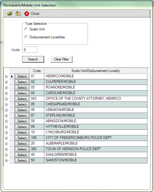 | • | Use the Code search option by entering the scale code number or a partial code number in the Code box. Click the Search button to display a list of all scale(s) that contain those number(s). Click the Select button next to the desired scale. |