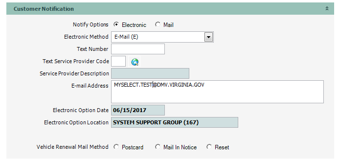 NOTE: When selecting either option for Vehicle Renewal Mail Method, the electronic notification will be removed.