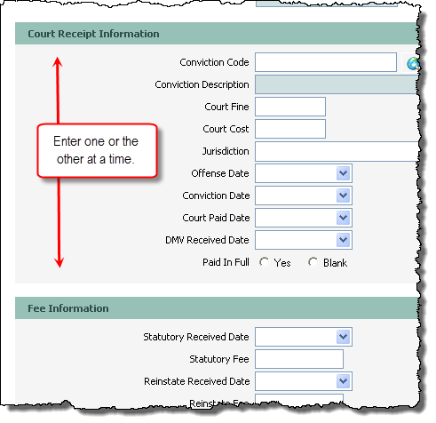 a)If the customer has a court receipt, enter the appropriate information in the Court Receipt section, or