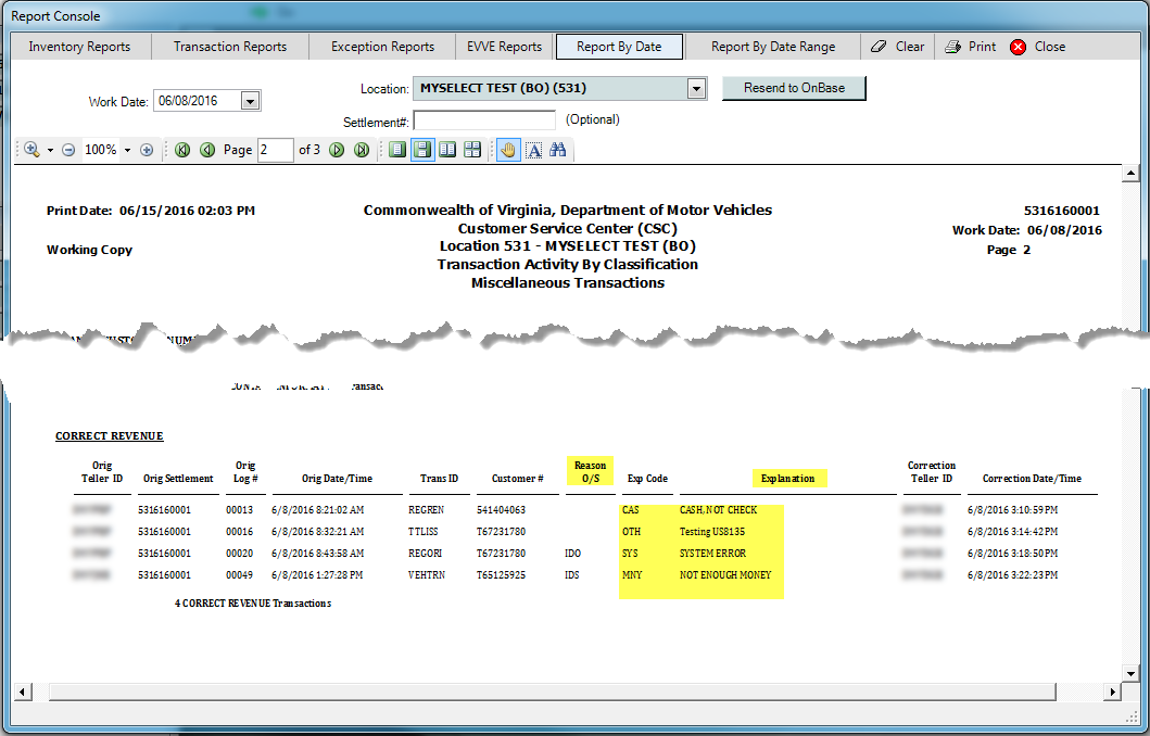 Reports>Transaction Reports>Miscellaneous Transaction Report Transaction Activity - Correct Revenue section The following changes were made to this report (highlighted in yellow): 1.The Reason Code column was changed to read as REASON O/S 2.The Reason column was changed to read as EXPLANATION 3.The Explanation column shows the description that corresponds to the Explanation code. |