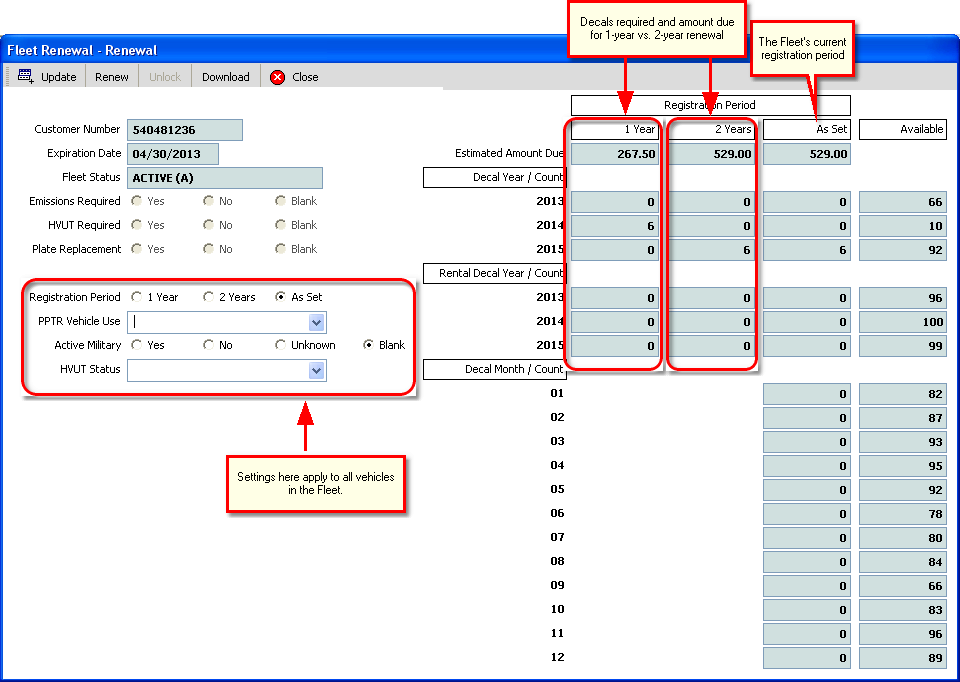Fleet Renewal dialog screen shot.  This dialog appears after clicking the Renewal button from the Fleet Renewal transaction.