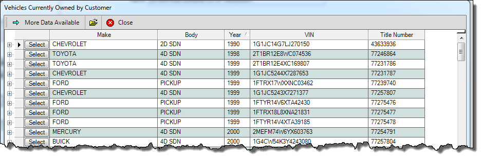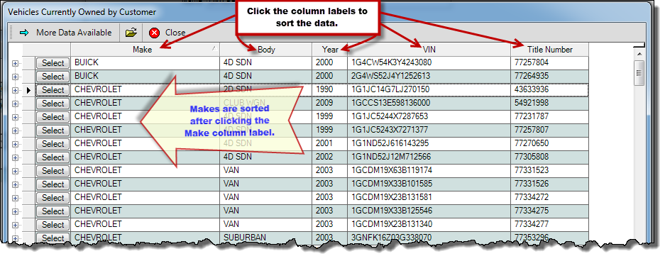 After opening selection grids, the data can be sorted by the column headings. Just click that column heading to sort in ascending order. Click again to sort in descending order.